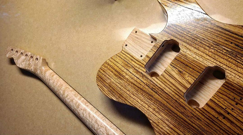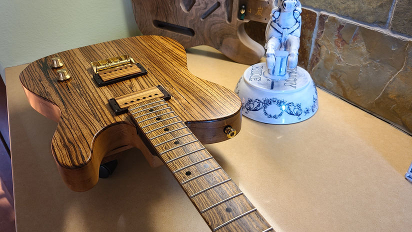 The "Zebra Tele-Gib" started out with book matching Zebra wood top with chambered ash body. Wenge wood neck with Bocote fingerboard, along with some best components you can find today. I must say this Tele-Gib set is one of my recent favorites built, both visually and tonally.