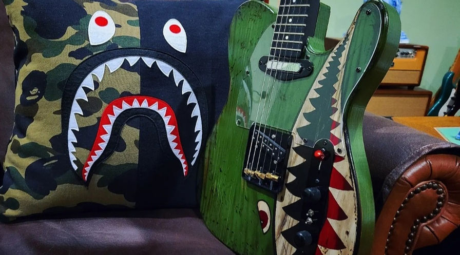 I've always had a passion for vintage and art guitars. They each hold their own unique story, created by artworks or years of being played and carried from place to place. They tell stories of where they've been and the people who played them. So, I'm here, trying to recreate the vibe of vintage guitar with some instantly recognizable iconic images: the shark mouth flying tiger.