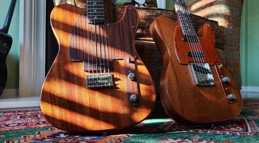 I have always been attracted to the woody, open sound of mahogany body guitars; to me, mahogany bodies offer a gnarly growl and legendary sustain. Therefore, I decided to build this "Mahogany Twins" telecaster set both with a solid mahogany body, the second twin Nashville Power T equipped with a modern pickup configuration with wiring modifications to provide total 16 tonal choices.